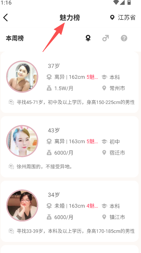 1、是江苏本地相亲社交软件,设广场消息等板块,含动态魅力榜功能,覆盖本地婚恋交友的核心互动场景。