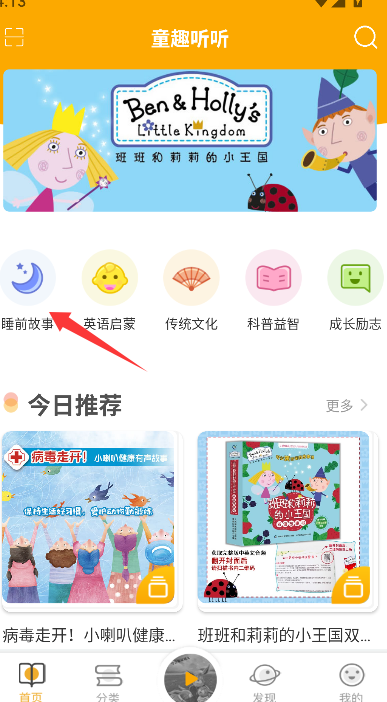 1、找到并点击“睡前故事”或带有相关标识的独立入口,进入专为该场景分类的故事列表页面。