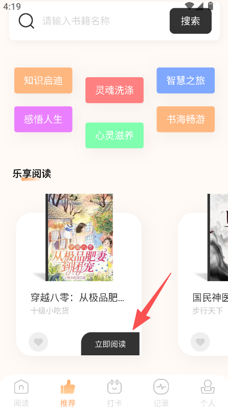 2、含知识启迪等分类标签,乐享阅读提供立即阅读,记录板块可写情节,完善阅读与记录维度。