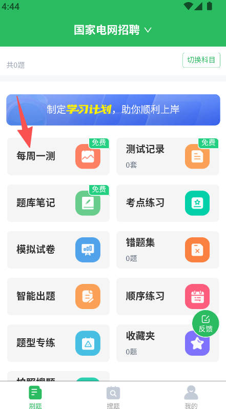 1、提供备考练习功能,进入刷题页面,选择每周一测等功能开展国家电网考试题目练习。