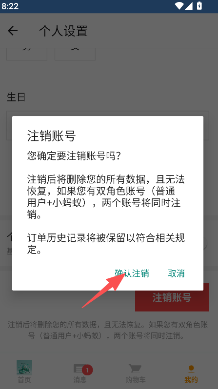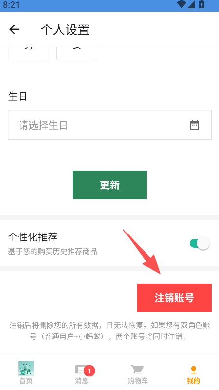 《小蚂蚁购物》是一款购物类软件,设首页、消息、购物车、我的等板块,我的页面含个人中心、订单管理、收藏等功能,个人设置可选择生日、管理个性化推荐,支持账号注销操作,满足购物及账号管理的日常需求。