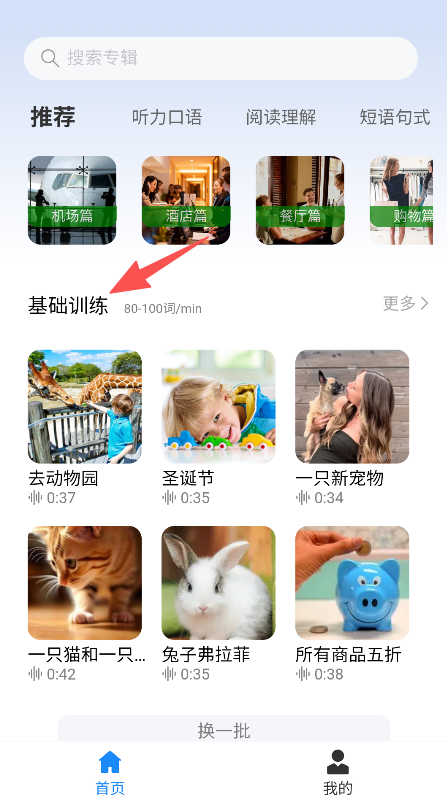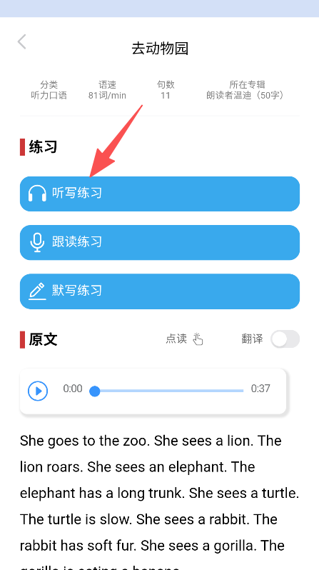2、提供多形式练习方式,含听写、跟读等,匹配不同英语能力维度的训练需求。