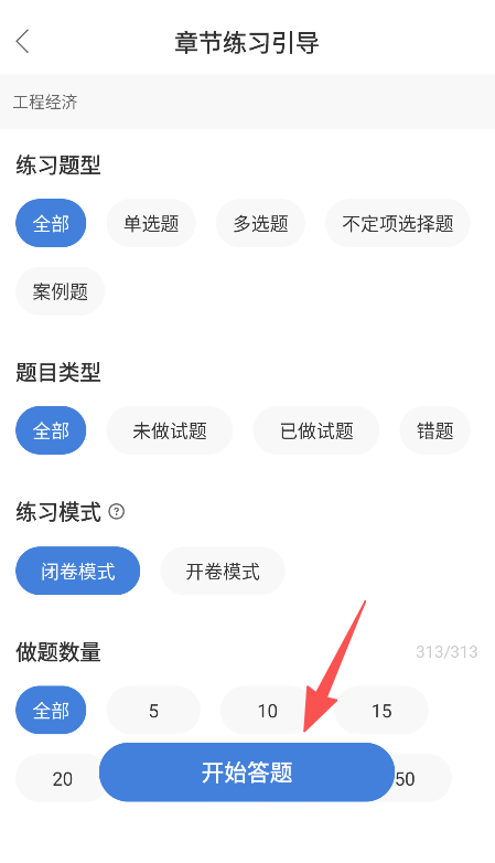 2、进入章节练习引导页,选定练习题型、模式及题量。