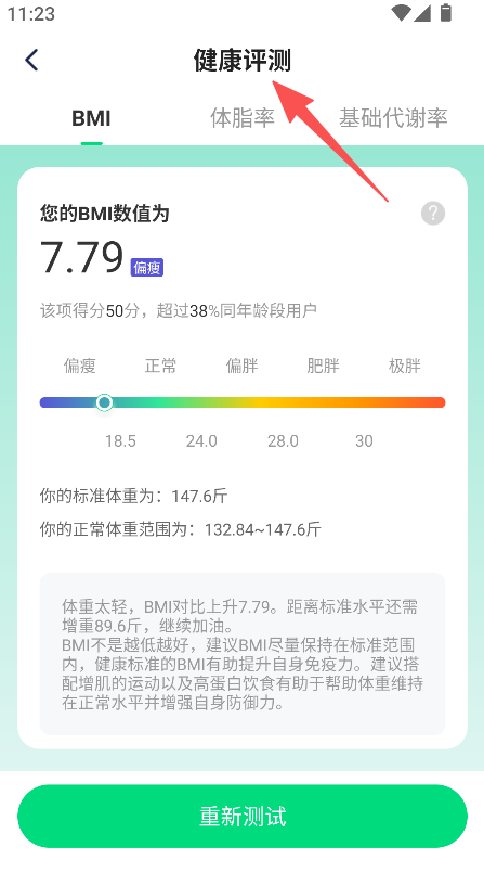 2、完成体重录入后,进入健康评测页面,查看BMI数值及相关身体建议。