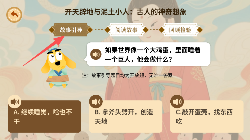 3、在主题页面参与故事引导互动,依次完成阅读与检验环节。