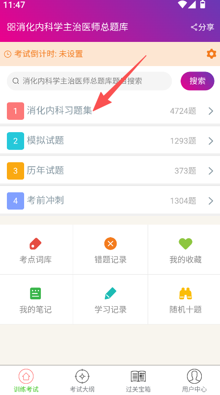 1、进入训练考试页面,点击消化内科习题集。
