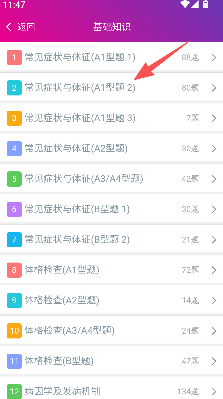 2、进入习题集页面后选择基础知识分类,点击对应题型的题目入口。