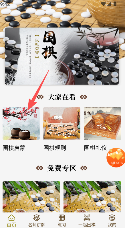 1、打开软件进入首页,可查看围棋启蒙、规则、礼仪等基础内容。