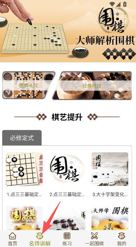 2、点击名师讲解板块,能学习大师解析及点三三基础定式等棋艺内容。