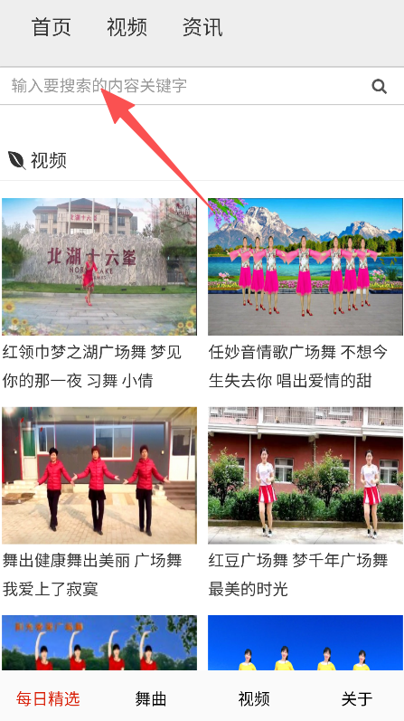 1、进入软件首页,在搜索框输入关键字查找对应广场舞内容。