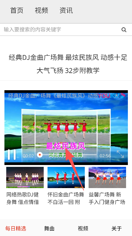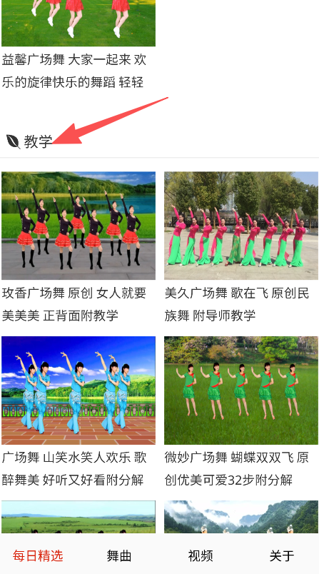 3、划分不同板块展示内容,可浏览每日精选及各类风格的广场舞视频。