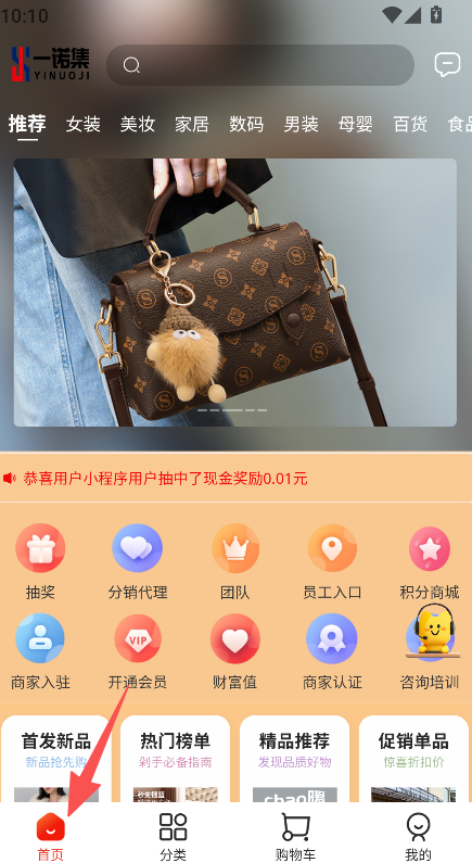 《一诺集》是一款综合购物软件,覆盖女装、美妆、母婴等多品类商品,设首页推荐、分类导航、购物车等板块,提供抽奖、分销代理、商家入驻、咨询培训等服务,还有首发新品、热门榜单等板块助力商品查找,满足购物及相关服务需求。