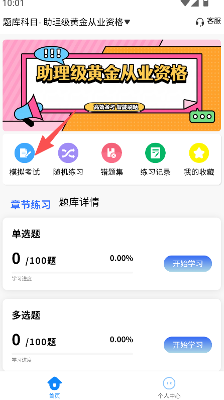 2、在科目页面选择模拟考试功能、进入对应练习模块。
