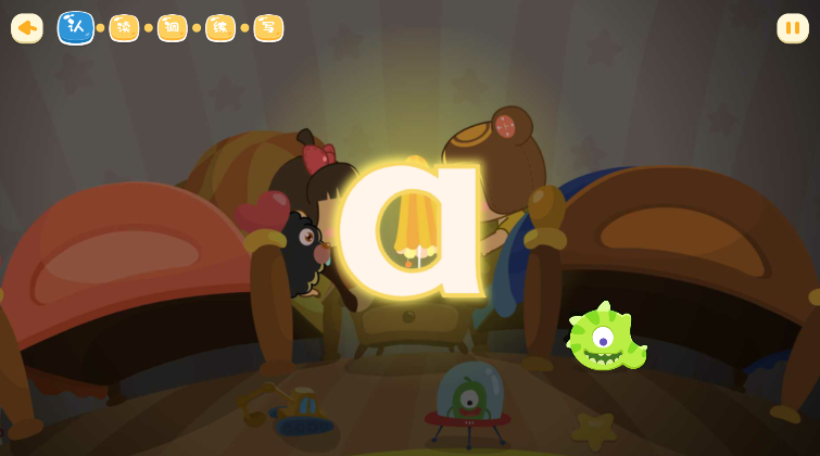 2、学习过程围绕具体情境展开。每个拼音知识点都融入如“拼音果园”、“字母赛车”等主题场景中。