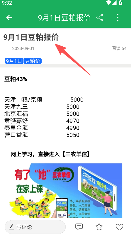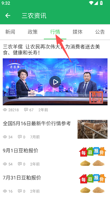 2、在三农资讯页点击行情分类、查看牛价豆粕等报价内容。