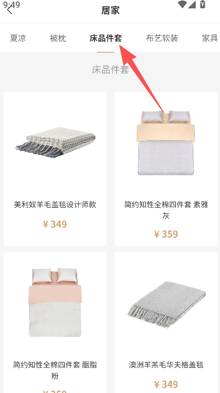 2、可在居家页面选择床品件套子分类,筛选出该类别下的商品,获取对应商品的展示信息。