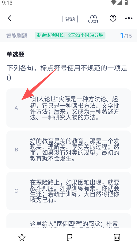 2、进入智能刷题页面,完成单选题的选项选择操作。