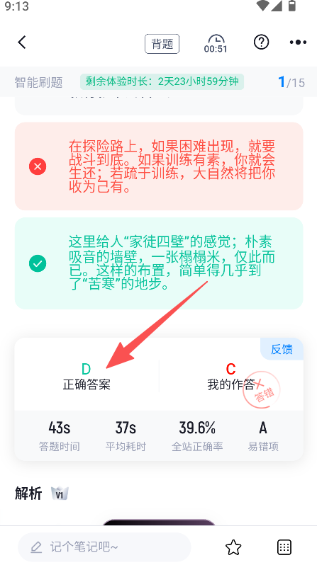 2、答题后展示正确率、平均耗时等数据,直观呈现学习状态,便于及时调整备考节奏与重点方向。