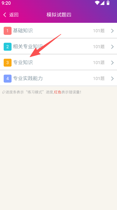 2、可在模拟试题页面选择专业知识模块,进入对应练习页面,开展该模块的题目练习操作。