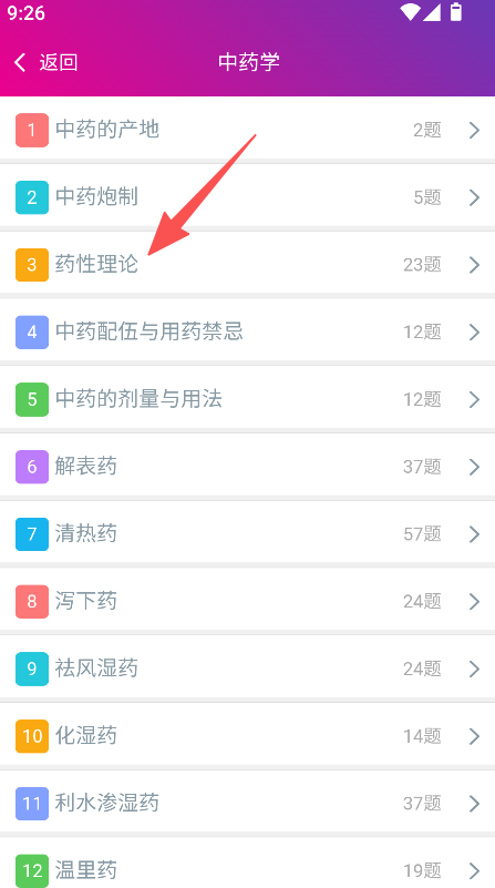 2、在章节列表中选择药性理论,进入题目练习页面。