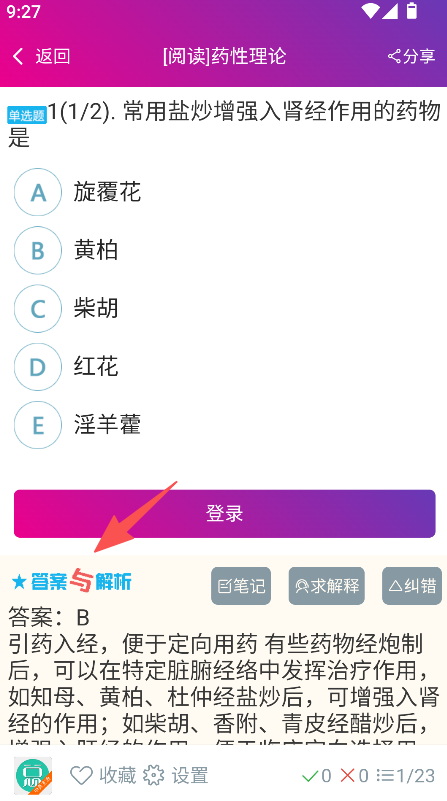 2、可在章节列表中选择药性理论等章节,进入对应题目页面,开展该章节的题目练习操作。