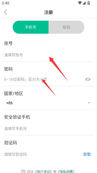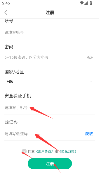3、输入手机号码验证码并勾选隐私政策点击注册,如同完成一次安全的身份绑定仪式,勾选协议即点头同意守护这座公寓的数字规则。