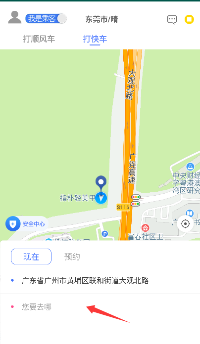 2、找到目的地输入框,点击后手动输入或从历史记录中选择本次行程的终点地址。