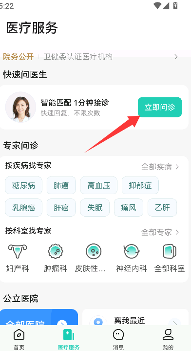 2、浏览并选择“立即问诊”功能按钮,点击后即可正式发起一次线上问诊流程。