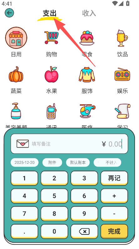 1、打开软件点击记一笔、进入收支记录页面选择支出或收入类别。