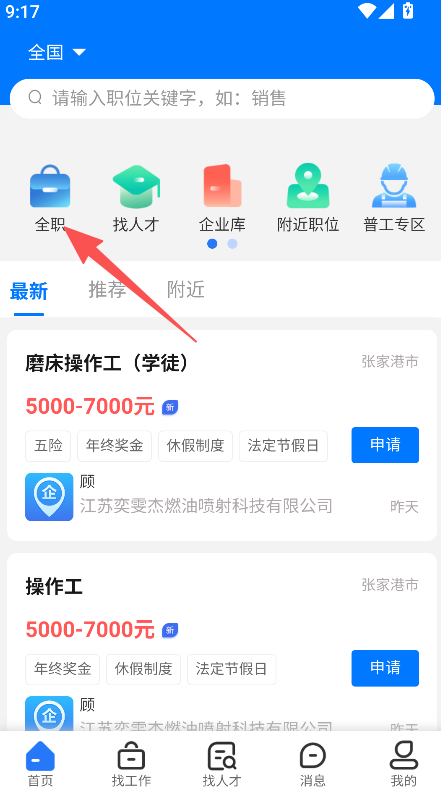 1、打开软件进入首页、选择全职板块浏览展示的职位列表。
