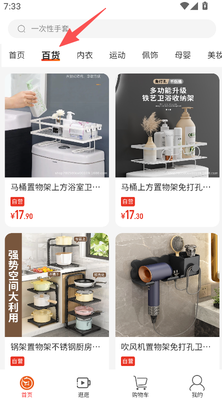 1、打开软件进入首页、选择百货等品类或搜索关键词浏览商品。