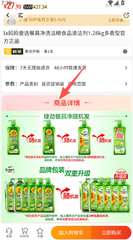 2、点击目标商品、查看其详情页的参数、保障及产品介绍内容。