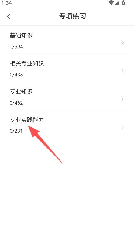 2、在专项练习页面,选择专业实践能力板块。