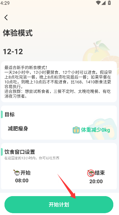 2、随后点击“开始计划”按钮,应用将自动生成一份预设的断食与进食时间安排表。