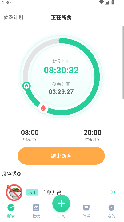 3、当需要终止当前断食周期时,在页面显著位置点击“结束断食”按钮以完成本次记录。