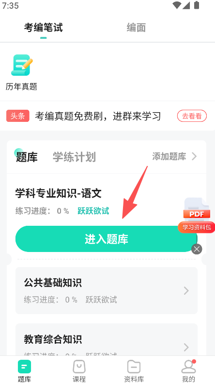 1、打开软件进入题库页,点击学科专业知识的进入题库。