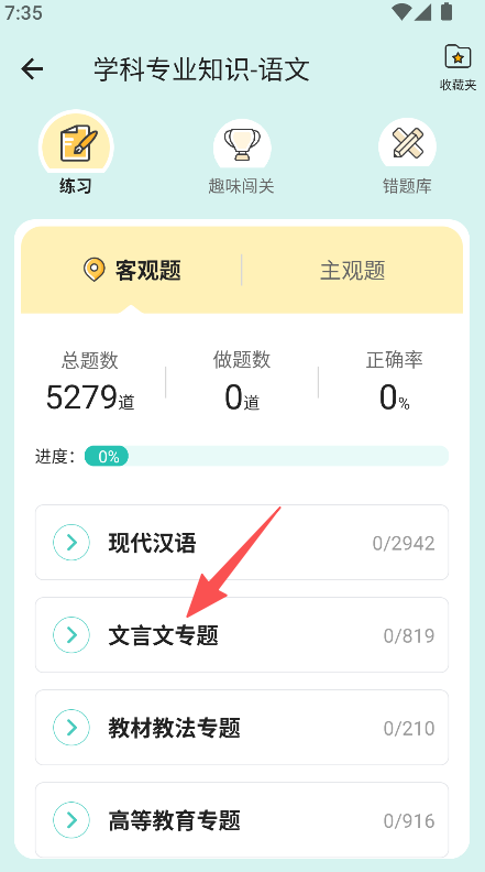 2、支持专题练习功能,选择文言文等专题,完成教招学科对应知识模块的专项刷题。