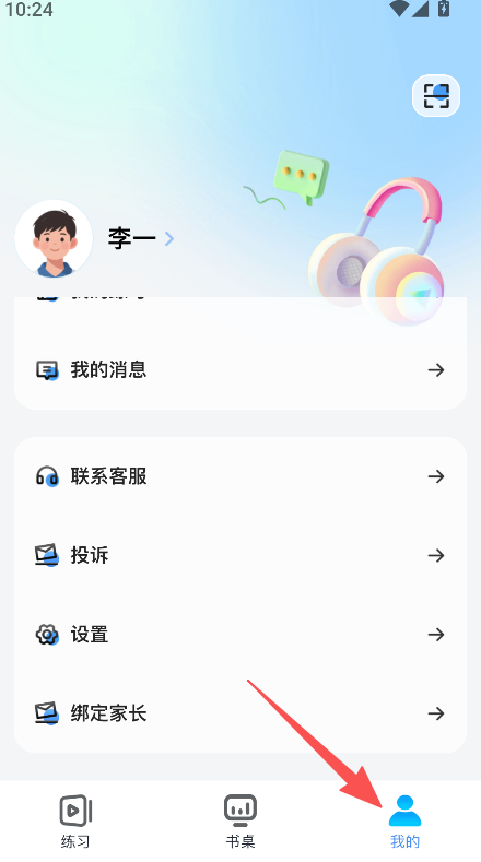 1、聚焦学习及账号管理,设练习、书桌等功能板块,含绑定家长等入口,适配学习及账号相关的各类需求。