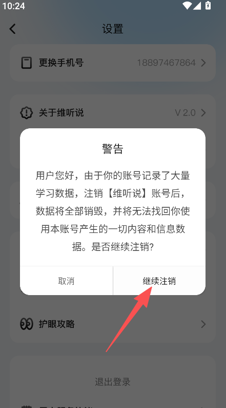 《维听说》是一款学习类软件,设练习、书桌等功能板块,含我的消息、联系客服等服务入口,支持绑定家长、账号注销等操作,注销时会提示数据销毁风险,适配学习及账号管理的需求,流程清晰助力处理学习相关事务。