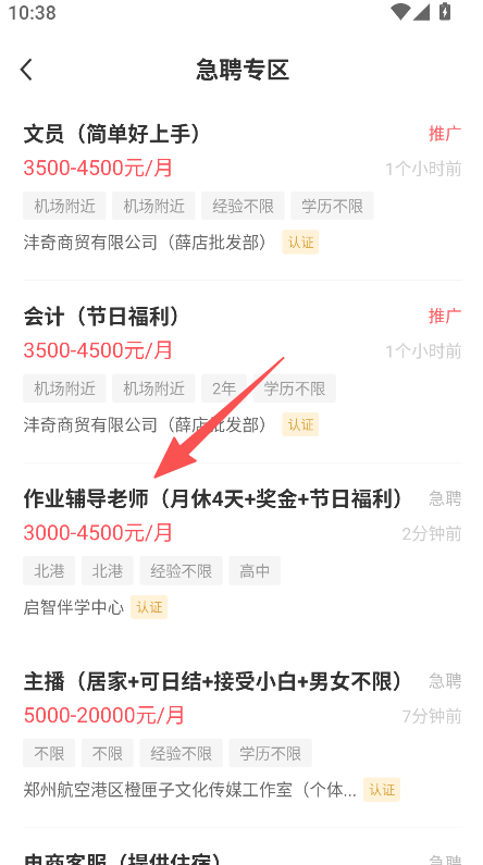 2、在急聘专区页面,选择目标职位内容。