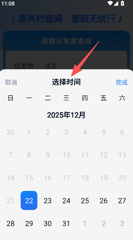 3、时间选择功能直观,日历式界面便于精准选定出行日期,提升差旅票务查询的精准性。