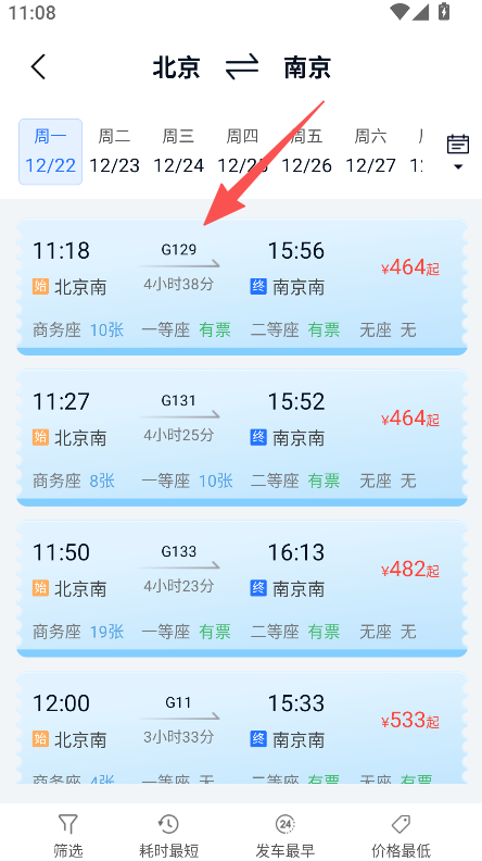 2、车次信息呈现清晰,时刻、票价、座位状态等内容明确,便于快速筛选适配差旅需求的车次。