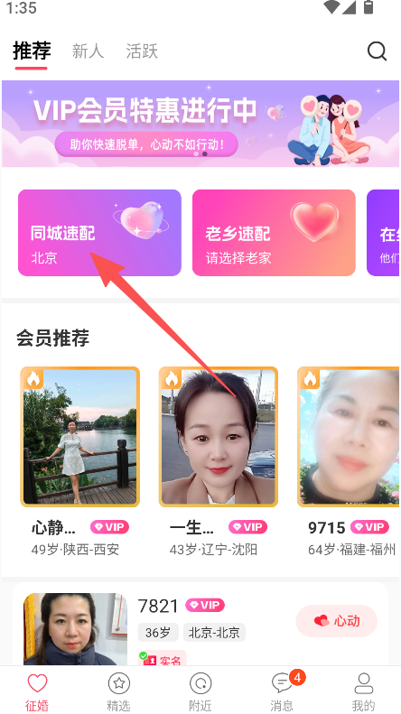 1、提供同城速配浏览功能,进入页面选择该选项,查看对应地域的婚恋交友用户列表。