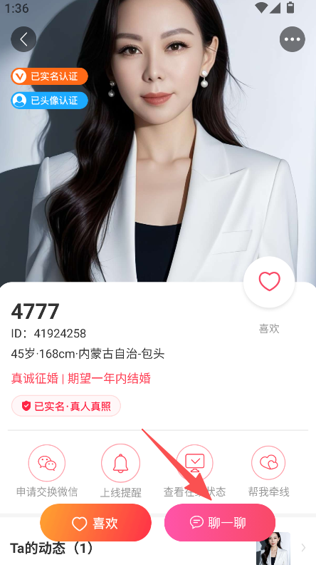 3、互动功能操作直接,聊一聊等按钮便于快速开展交流,降低婚恋社交的沟通门槛。