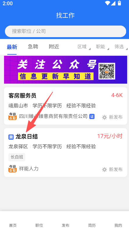 1、提供找工作浏览功能,进入首页选择该选项,查看各类招聘职位的列表内容。