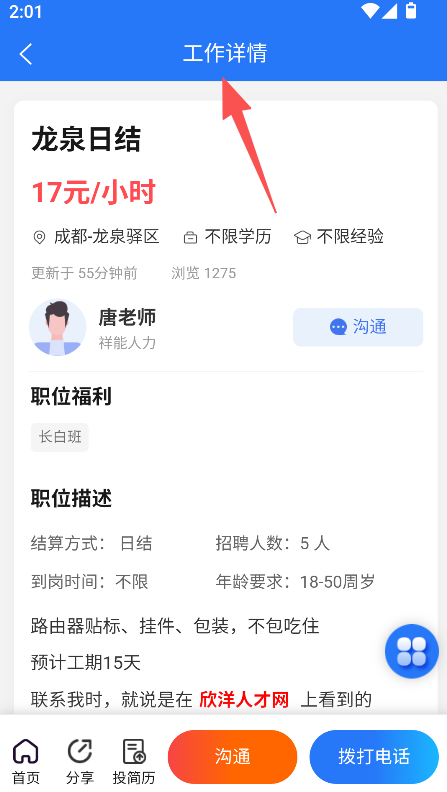 3、进入工作详情页,点击沟通完成互动操作。