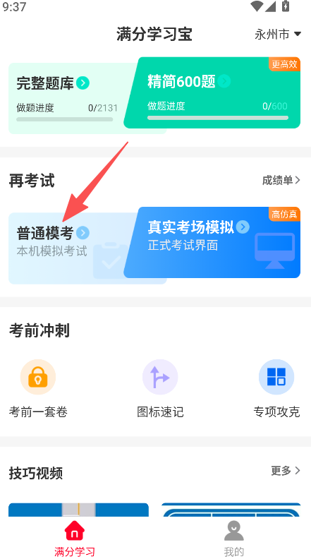 1、打开软件进入满分学习页面,选择普通模考选项。