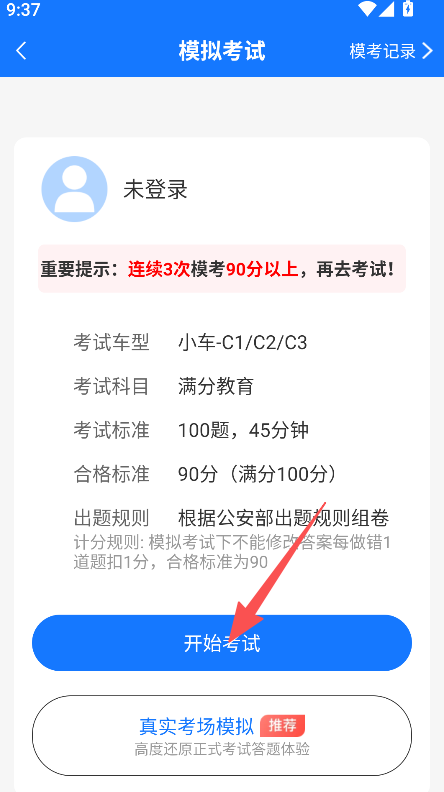 2、在模拟考试页面确认考试信息后,点击开始考试按钮。