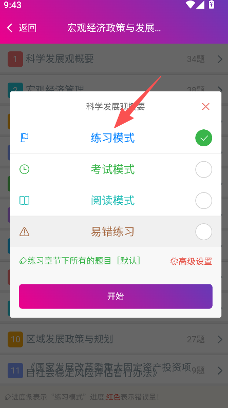 2、在章节下选定练习模式,点击开始进入做题界面。