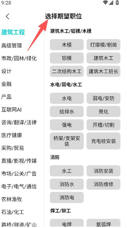 1、提供期望职位选择功能,涵盖多行业大类及细分岗位,可选定契合自身技能的目标求职岗位。